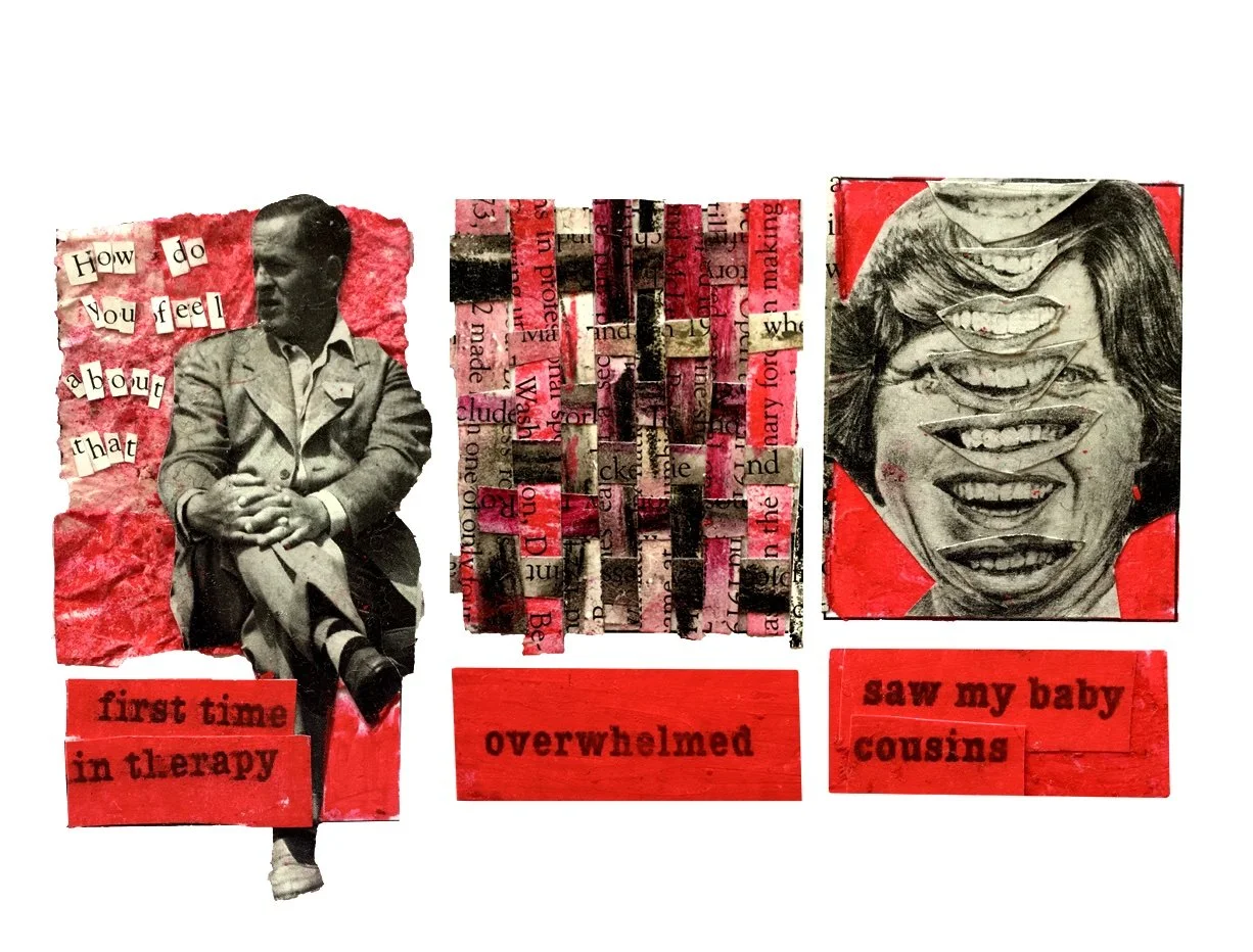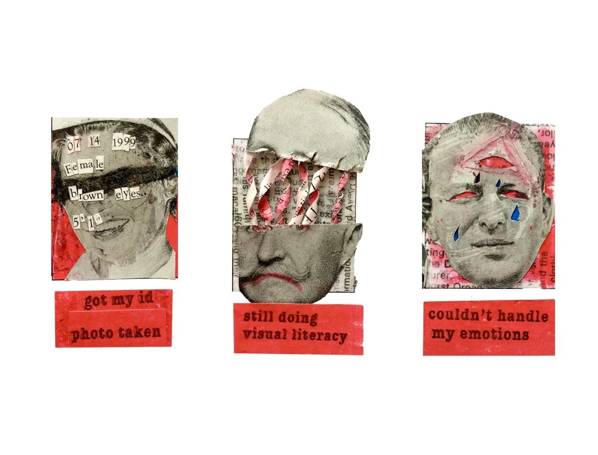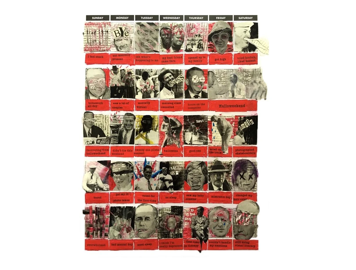One collage for everyday of the month made up of photos from a golf book, a newspaper and oil pastels. The collages are based on my activities and emotions through each day.