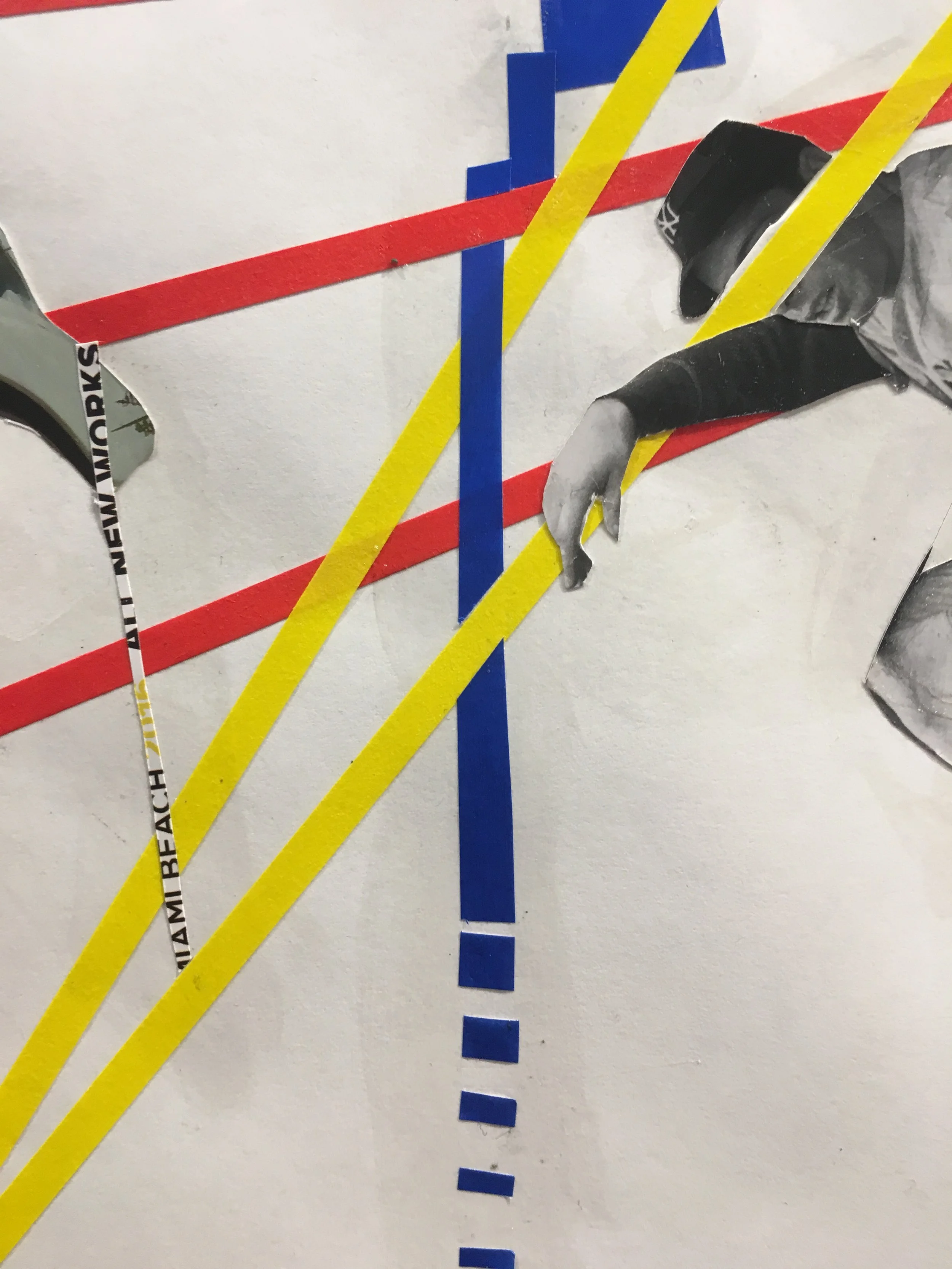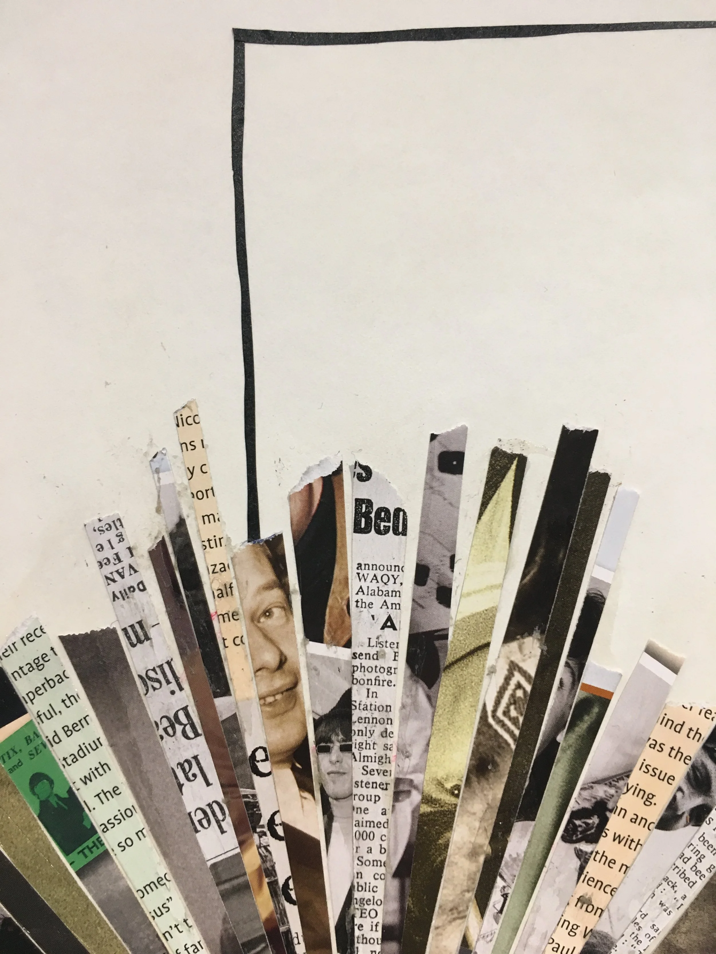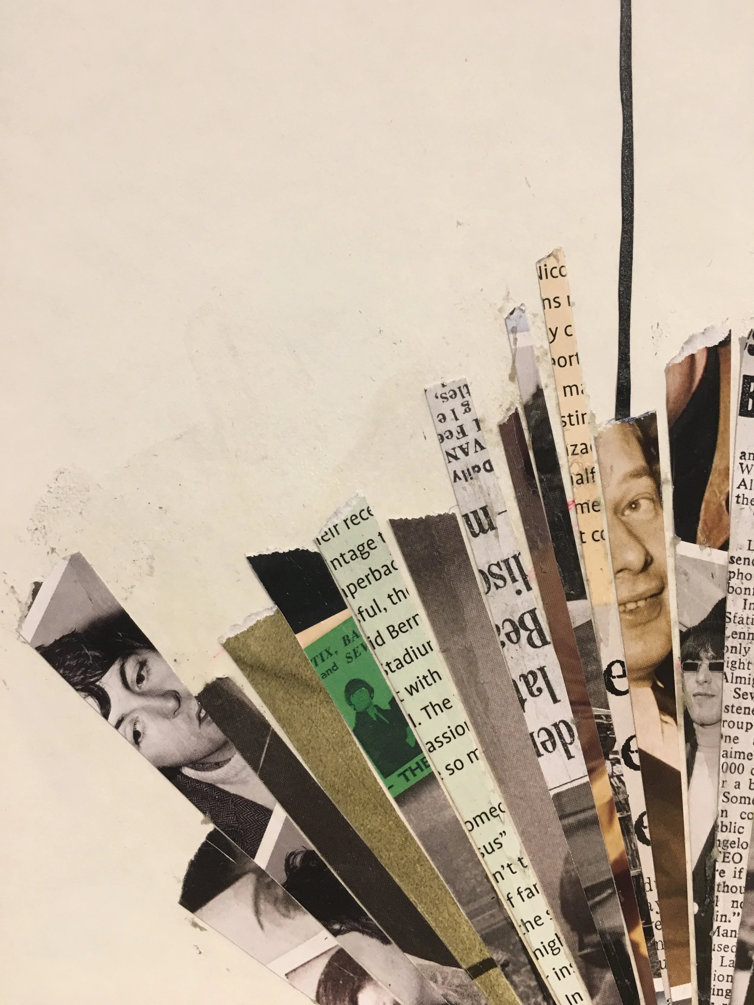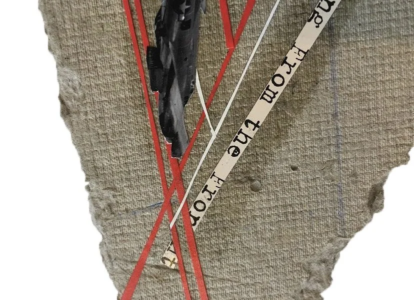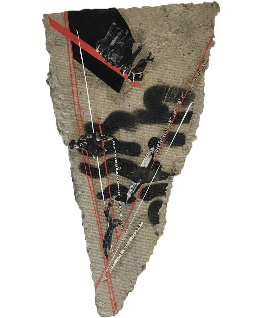 Various collages on paper, inside book covers and on a broken board.