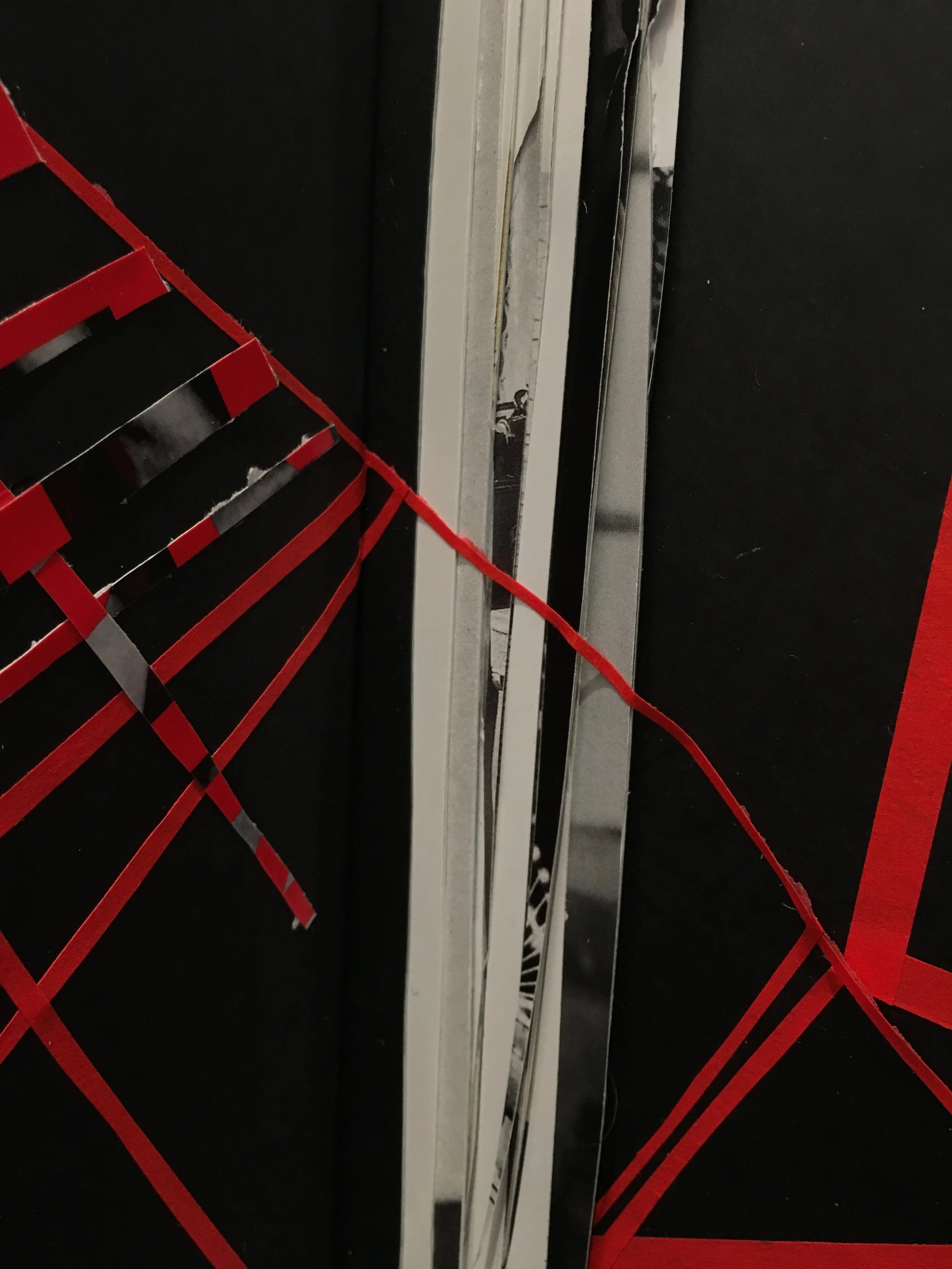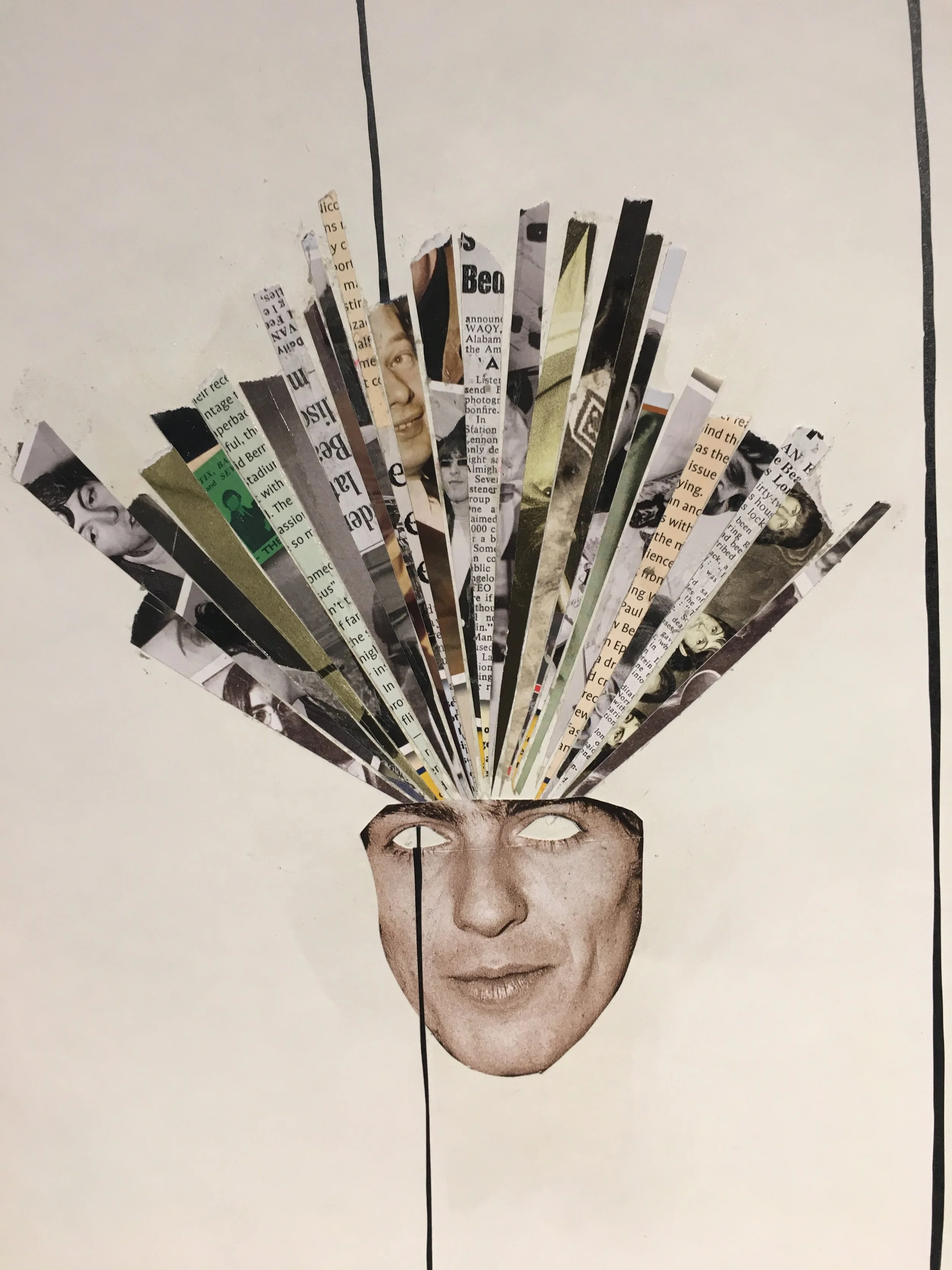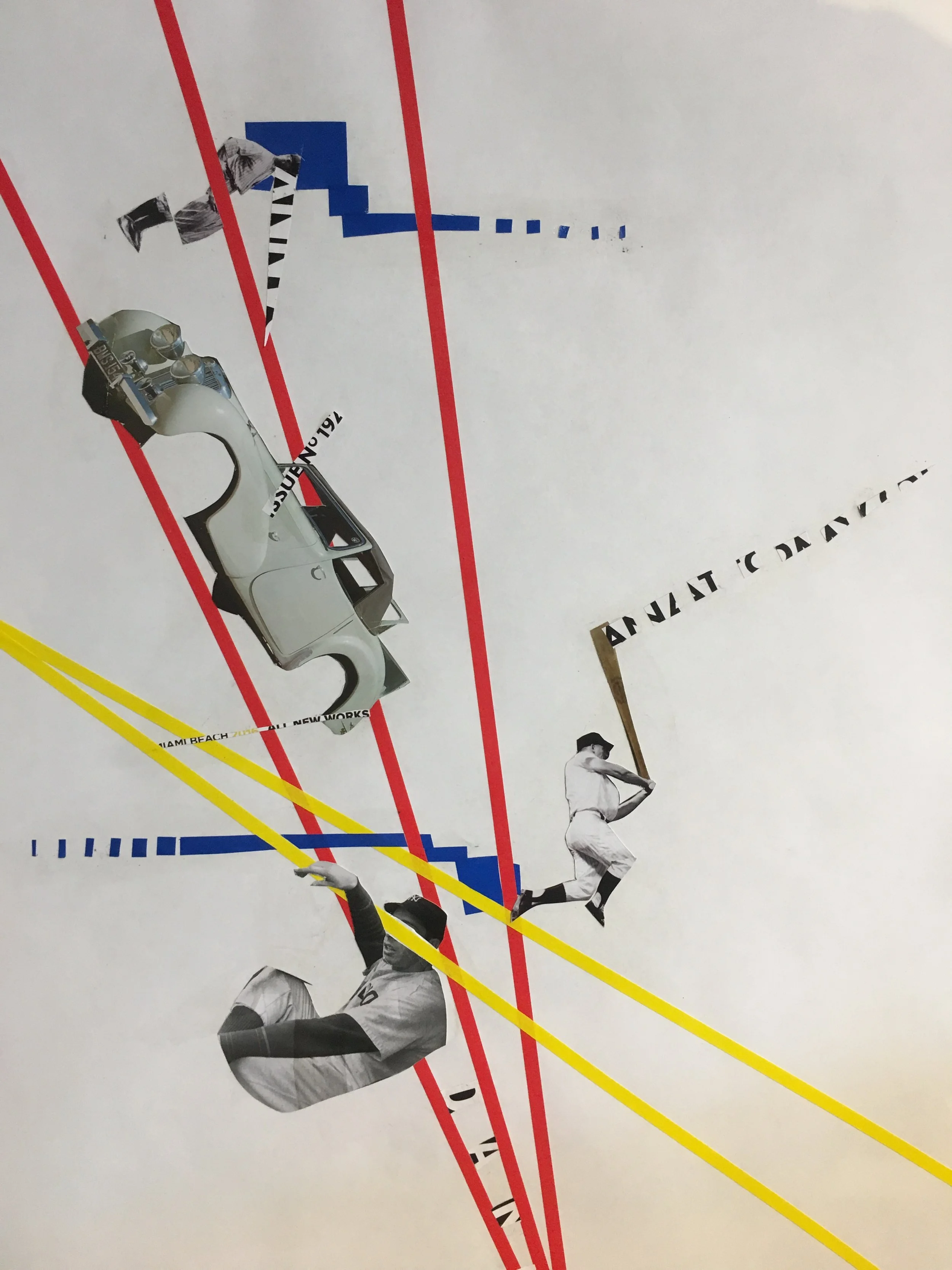 Various collages on paper, inside book covers and on a broken board.