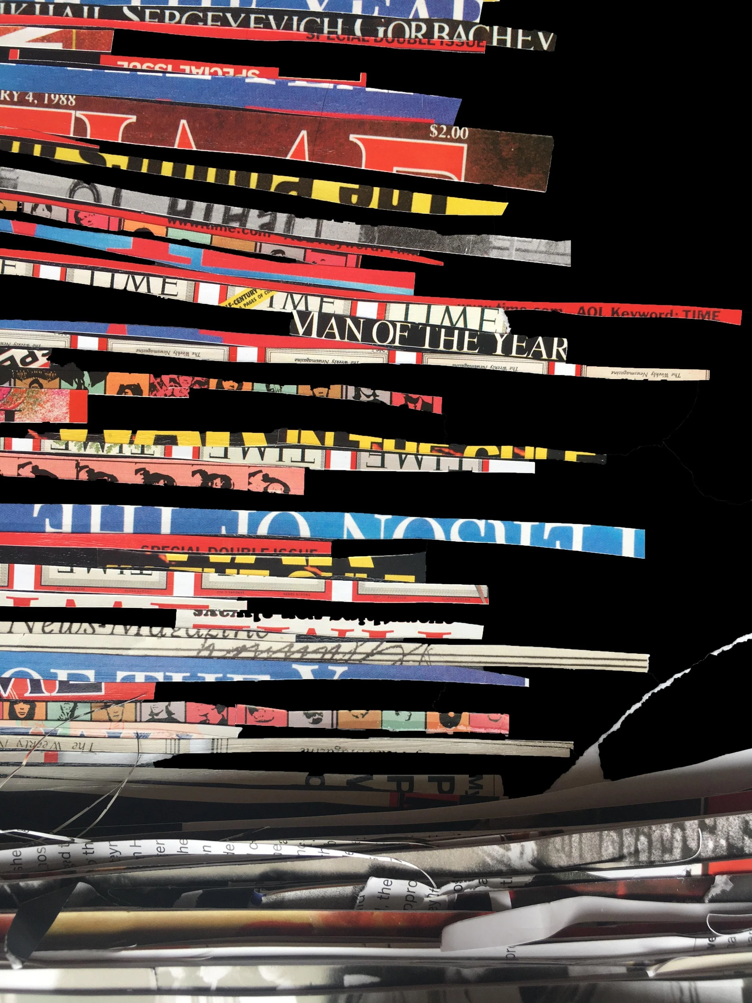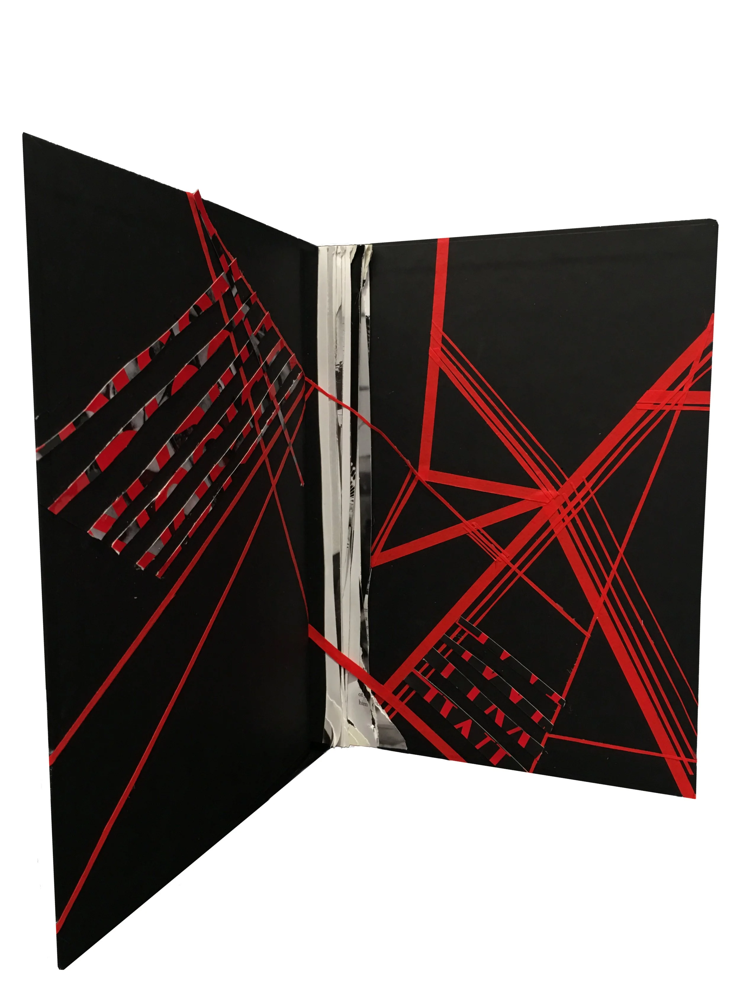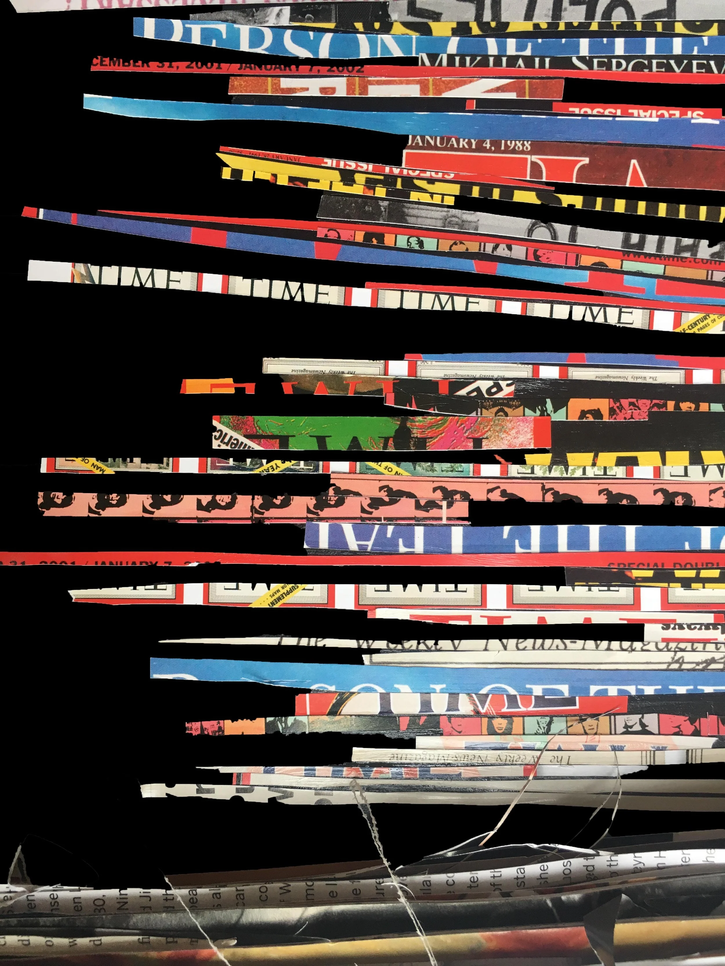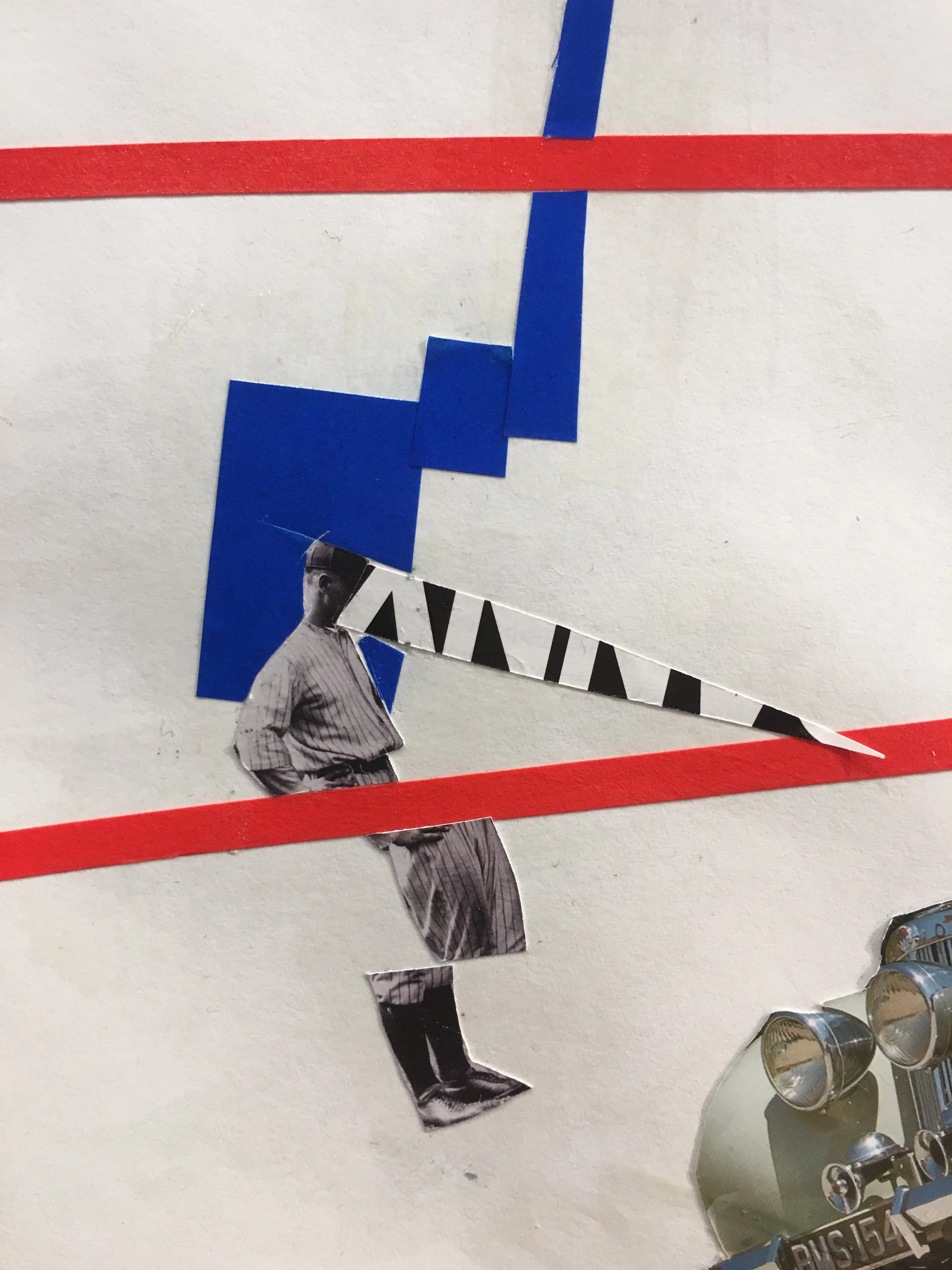 Various collages on paper, inside book covers and on a broken board.